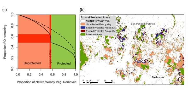 An interesting result is that if we increased protected areas by 5% (which is <1% of the state area), we could increase phylogenetic diversity of eucalypts by 33% (see the dark red blocks in the figure).