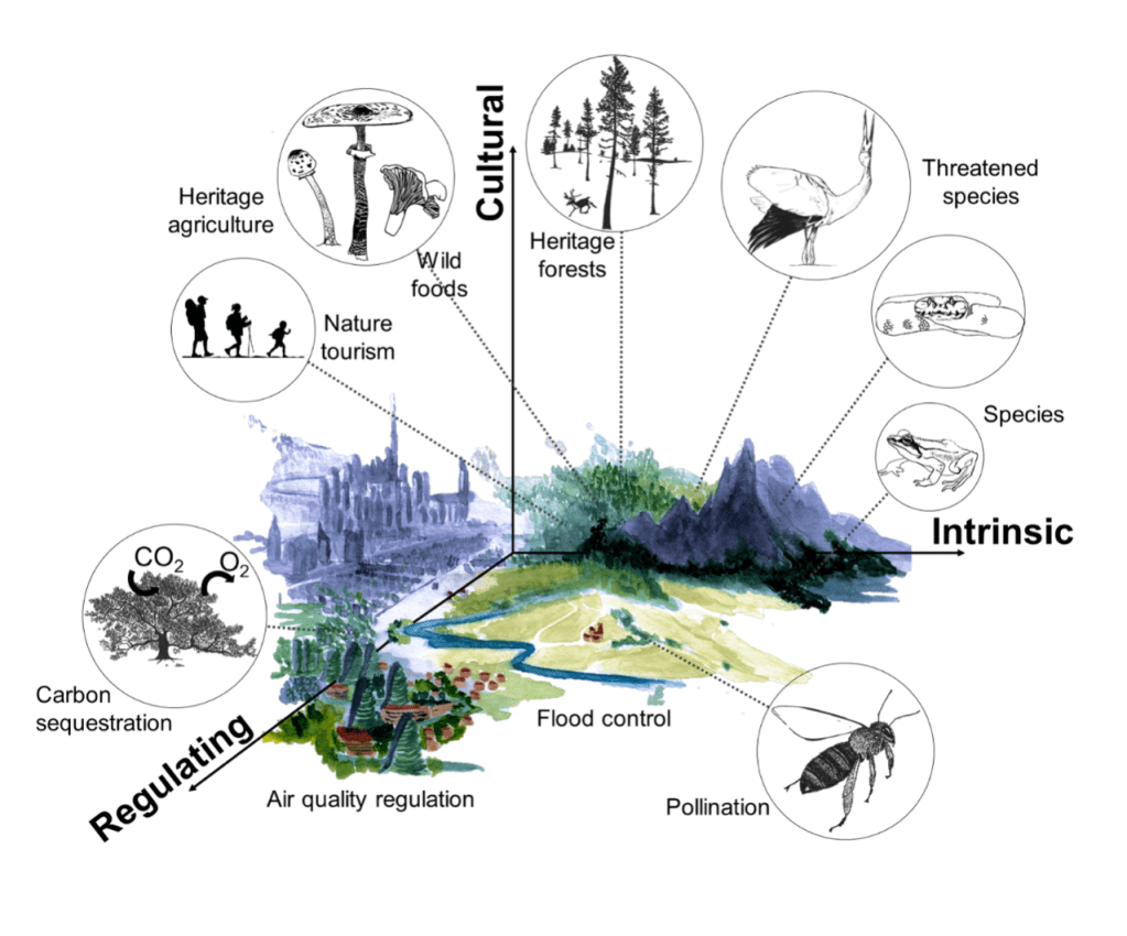 The many values of nature: Intrinsic value reflects the high value attributed to biodiversity (e.g. species) and ecosystem functioning, independently of human presence. Cultural value reflects the high value placed on natural heritage and traditions rooted in nature (e.g. the diversity of mushroom and plant species for gathering, heritage landscapes, nature tourism). Regulating value places high value on ecosystems that contribute to natural processes that sustain societies, such as flood control, air quality regulation, pollination, and climate regulation. (Illustrated by Dr. Camille Martinez-Almoyna)