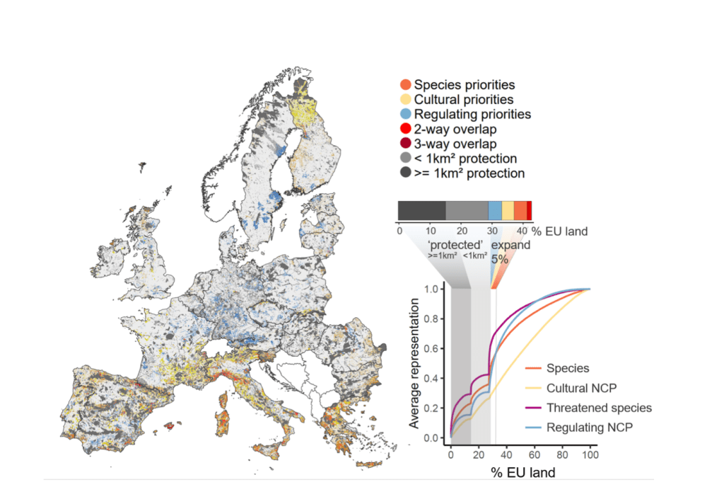 We also identified priority areas given what is already protected by the Natura 2000 network–so candidates for expanding protection. Natura 2000 is one of the densest conservation networks in the world, covering about 20% of the EU, but it only protects 30% of the key areas for NCP, and 36% of vertebrate species distributions on average. Our results show that an additional 5% put into protection could double the current protection of vertebrate species and regulation NCP, and would protect almost 75% of threatened species distributions on average (Figure below).